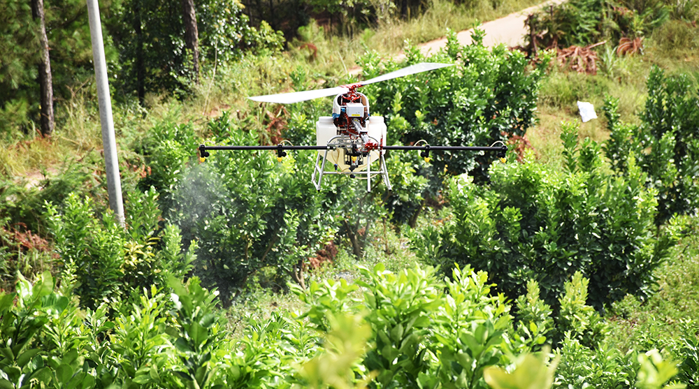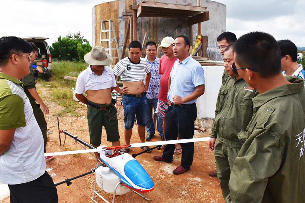 近日,一架天鹰兄弟公司研发的TY-787 型植保无人机亮相江西省赣州市信丰县脐橙果林上空,开启了全市精准防控果林病虫害的新模式。这引来了不少当地群众的围观。