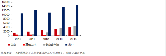 农场主会将植保服务外包给专业飞防大队,后者正是未来植保无人机的购买主力。植保服务是一个综合性服务体系,而不是简单的把药喷到田里。同时,植保无人机的应用还涉及到飞机维护、保养、维修、保险、法律法规、植保应用等相关产业,其中涉及大量的机械、农业等专业知识。因此,在我国适应土地流转,大规模农业集约化经营的趋势,运用科学化、专业化的方法管理农业,将各个任务作业拆解外包给专业化的团队是必然选择。