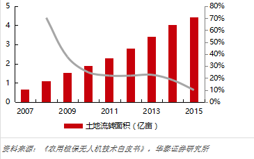 土地流转有利于土地的规模化经营,大面积的农田可以更大发挥植保无人机的效率,分摊植保无人机的成本,并且种植大户和专业合作社的财力更强,基于长期的规划也更愿意对改进生产效率的植保无人机的投资。