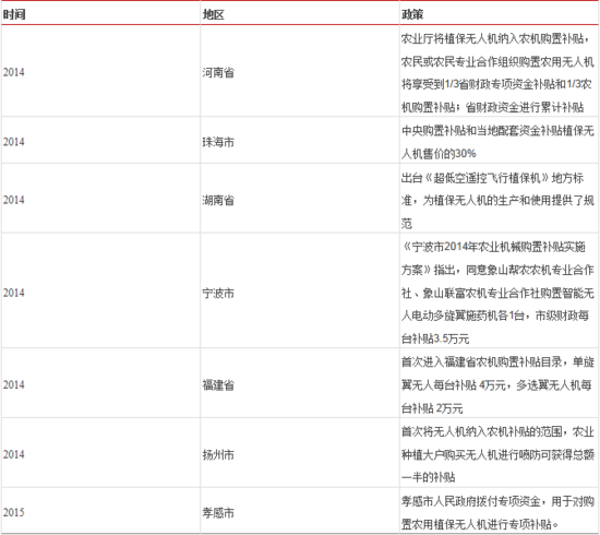 多省地方补贴陆续出台,如河南省率先对植保无人机补贴。2014年省财政对购置农用航空器进行累加补贴,河南省财政列出专项资金给予购机补贴,农民或农民专业合作组织购置农用无人机将享受到1/3省财政专项资金补贴和1/3农机购置补贴,只需掏1/3的市场价即可购买到农用无人机。