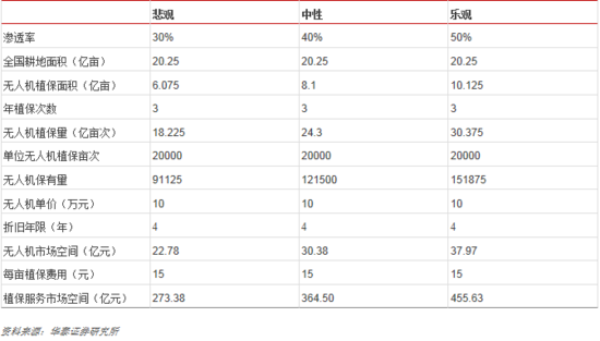 悲观、中性、乐观预期下,每年无人机整机市场空间22.78亿、30.38亿、37.97亿,每年的植保服务市场空间273.38亿、364.50亿、455.63亿,中性下全产业每年的市场空间接近400亿。很明显植保服务的市场空间将远远大于无人机机器制造本身。伴随技术进步,无人机植保作业效率提升、无人机的寿命会增加,还会导致无人机市场相对植保服务市场更小。