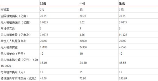 悲观、中性、乐观估计下到2020年累计无人机植保整机市场空间15.19亿、24.30亿、45.56亿,规模更大的是植保服务市场,分别达到45.56亿、72.90亿、136.69亿。若考虑庞大的无人机保养维护,零部件(如电池)更换市场,泛无人机植保市场空间巨大。