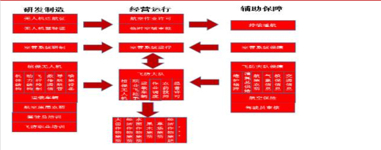 中游经营运行环节的主体是飞防大队。飞防大队应该具备植保无人机、运载车辆、无人机操控手、飞行调试员、农药技师等,还需要获得经营许可以及通用航空法规下的航空作业许可。同时,飞防大队在飞行进行作业时,还应该向相关空管部门申请临时空域。飞防大队直接面向农业种植用户,其经营活动为用户提供大田作物施药、经济作物施药、水面作物施药、果木施药、草场施药及经济作物施肥等植保服务,获得产业的收益产值。