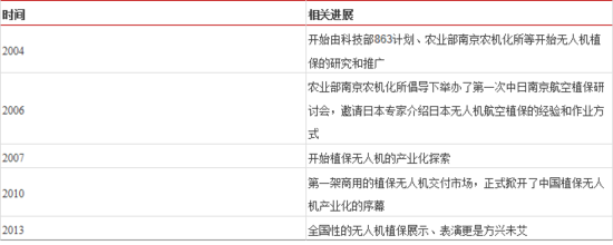 我国的植保无人机起步较晚。真正开始研制的时间只有十多年,具体进程梳理如下: