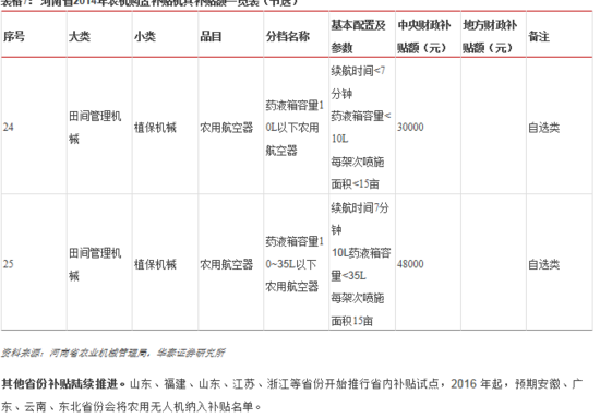 2014年河南省共对130台植保无人机进行了补贴,2015年将继续加大对植保无人机等农机的补贴力度,推进农业机械化、规模化发展。最近发布的《2015年河南农机推广补贴目录第一批》显示,共有7家企业15款植保无人机产品入选,涵盖目前市面上所有植保无人机样式。从有效荷载方面看既有5升的小机型,也有10~16升的中等机型,更有20~35升的大机型,补贴金额2.5万-5万元。