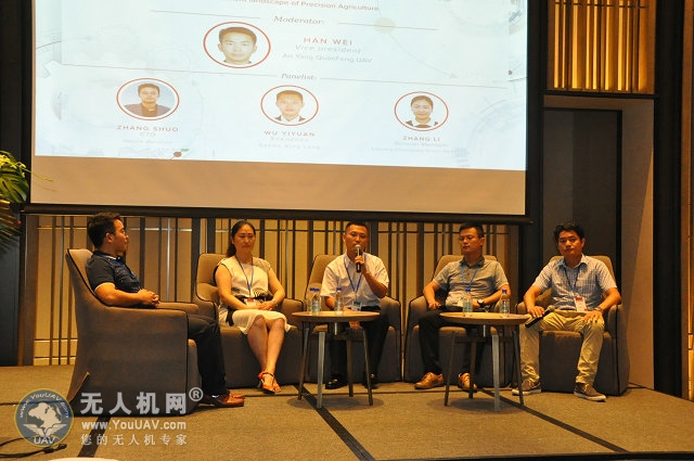 4点15分,由安阳全丰航空植保科技有限公司副总韩伟先生主持,无锡汉和航空技术有限公司总工程师张硕、深圳高科新农技术有限公司总经理吴義元、辽宁壮龙无人机科技有限公司总经理张黎、酷农航空植保科技有限公司总经理刘力波参与组成讨论组,以“无人机农业行业应用”为主题展开讨论。