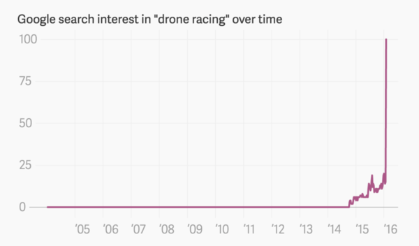 截至目前,这条视频已经被观看了 307 万次。它影响了很多人,甚至被看成是无人机竞速运动的开篇。科技媒体 Quartz 从 Google 搜索记录发现,2014 年以前,“无人机竞速”(drone racing) 这个词甚至根本就不存在。