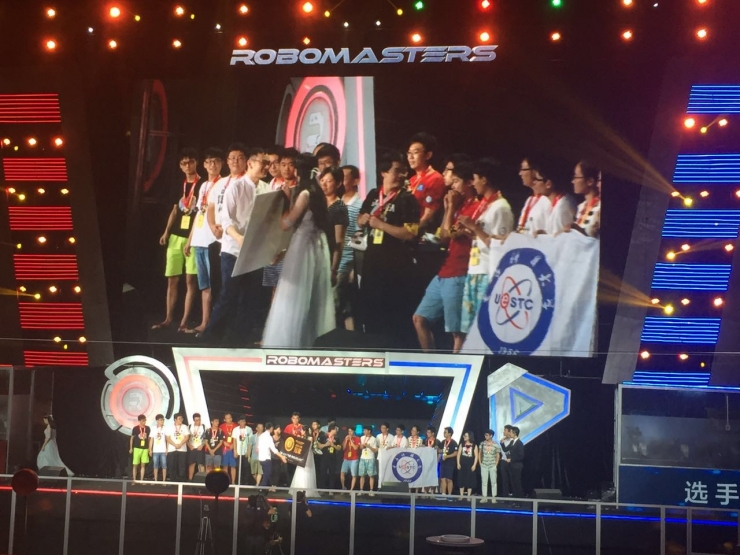 汪滔为Robomasters冠军电子科技大学的One Point Five S战队颁奖
