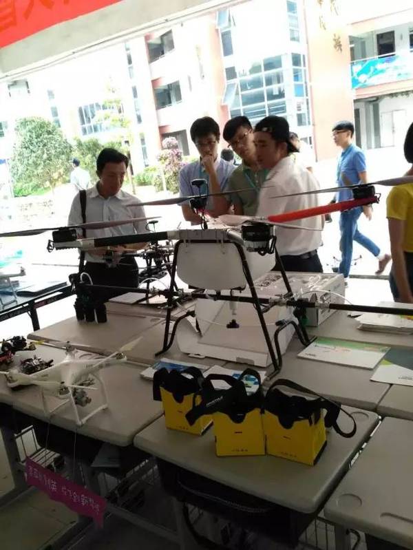 再回到活动现场,机器人随着音乐舞动,无人机配合节奏飞翔,整个活动可以说是生动有趣且科普味十足,在东圃中学的展厅里,无人机可谓是赚足了眼球,多旋翼植保无人机、单旋翼植保无人机、穿越机、航拍机同聚一个展台,那场面还是比较震撼的!引来大量家长、学生驻足观看!