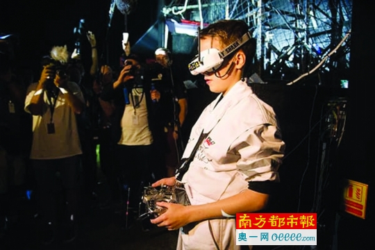 无人机这个名字听上去很性感,但跟在巴基斯坦西部发射导弹、一次能飞行24小时的“掠食者”不同,这里的无人机指的是四旋翼飞行器:四个螺旋桨围绕着位于中心的机身,移动速度可达90m ph,但体型娇小,对角线方向桨对桨距离平均也就25厘米。竞技用机设计略有不同,但操控者(或称“飞手”)都是戴着V R眼镜,连接内嵌在无人机上的摄像机,实现第一人称视角(FPV)。