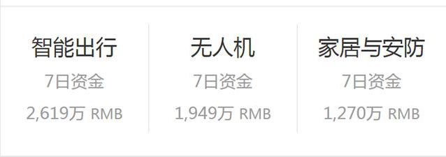 行业整体对比看来,「智能出行」还是行业霸主,7 日筹资达 2619万。 「无人机」类目依靠两款大热的标志性项目以 1949 万得以保持次席。「家居安防」顶掉「数码与周边」以 1270万的七日筹资重新回到前 3 甲,与昨日数据相比 只有「无人机」类目有明显增长。是否表示在众筹的大风口中无人机的大热依然会持续一段时间?