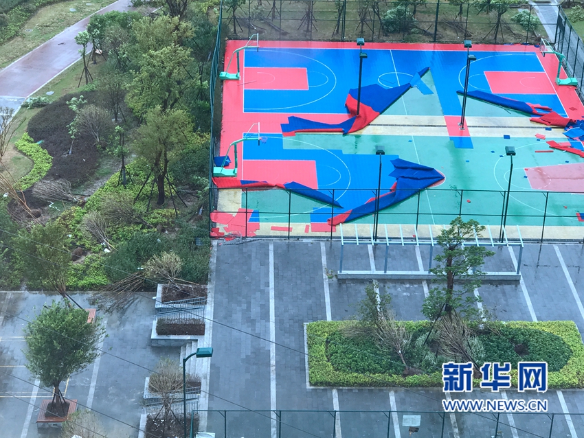 福州晋安区光明港公园操篮球场地面被大风撕裂。