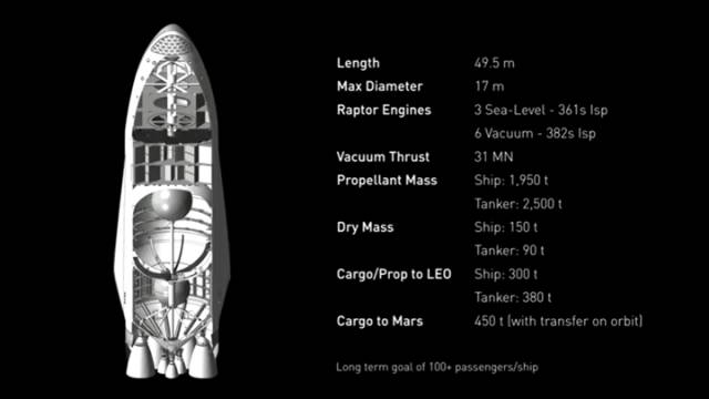 接着,马斯克给出了推进器、飞船和猛禽引擎(Raptor engine)的相关参数,并表示,这艘飞船非常的大,可以搭载100人。