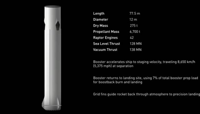 太空船的推进器使用了42个猛禽引擎,能产生1.3万吨的推力,以帮助飞船升空。整套系统飞向大气层,受到的最大风阻为3209公里每小时。