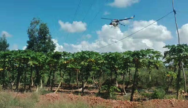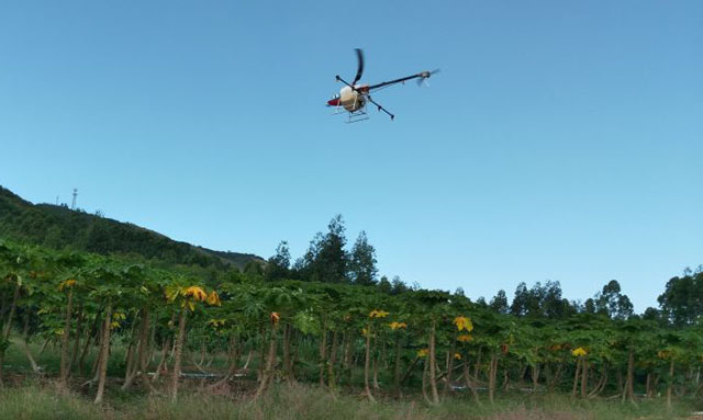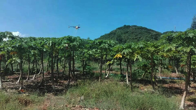 在木瓜林地,在操作人员的遥控下,天鹰兄弟TY-787植保无人机起飞,在农场内的木瓜种植地上方低空飞行,雾状的农药被均匀地喷洒到树木上。据了解,每架无人机每次可以携带17公斤药水,完成20至25亩地的喷药作业。一架无人机一天可以作业500亩,喷药效率可以达到人工的30倍。与人工作业相比,植保无人机具有效率高、效果好、适用性广、综合成本低等优势,采用植保无人机进行施药,不仅节省劳动力,而且节约用水,有效地解决了农药残留和土壤水源污染问题。