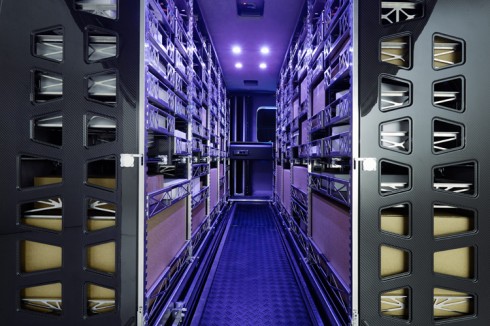 它的动力是75千瓦的电动系统,续航范围260千米,这个比亚迪也能做,就不多说它了。真正厉害的地方在于,这货有一个全自动的货仓,到达目的地范围之后,坐在驾驶舱就能完成取件的全部工作,并将包裹挂载到车顶停放的无人机下!