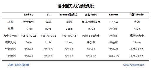 事实上,无人机的折叠式设计早已成为近两年以来最热门的设计手法。众多高科技企业,纷纷欲通小型无人机抢占市场,如零度智控的Dobby、曼塔S6、Yuneec Breeze、腾讯与深圳零度联合研发的空影YING等。据译见观察到,很多业内人士认为,目前无人机产品越来越轻便,随着技术的进步,未来无人机产品终将实现“口袋化“。