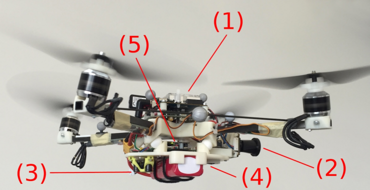 上图就是苏黎世大学研发团队在实验中用到的四轴无人机。(1)机载计算机;(2)向前的鱼眼摄像机;(3)TeraRanger One远距离感应器;(4)向下摄像机;(5)PX4自动飞手。发动机可以倾斜15度,提供三倍的偏航控制,同时集体推力只会降低3%。