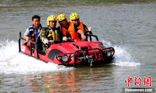 抵达现场后,救援官兵立即开展了雷达定位、废墟救援、狭小空间救援、垮塌现场综合救援、孤岛救人、定点抛投、冲锋舟操作等科目。在水域救援现场,救援人员第一次引进无人机、水陆两用救援车参加演练,大大提高了救援效率。图为水陆两用救援车营救“落水”者。