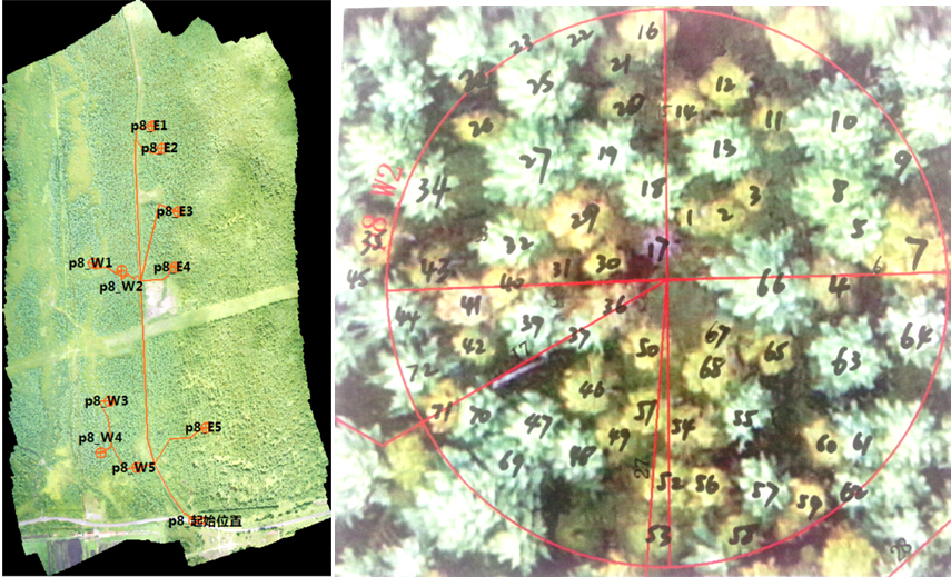 为有效解决这一瓶颈问题,森林遥感课题组历时两年完成了“无人机森林调查系统”的硬件构建和测试飞行工作。此次实验主要利用2015年8月无人机航拍得到的正射影像进行野外调查点的选择,并以正射影像为底图,以卫星定位系统作为辅助,通过对无人机正射影像的现场快速解译(如枯立木、倒木、树种和单木相对大小等),使得地面单木测量直接与无人机影像上的单木对应。