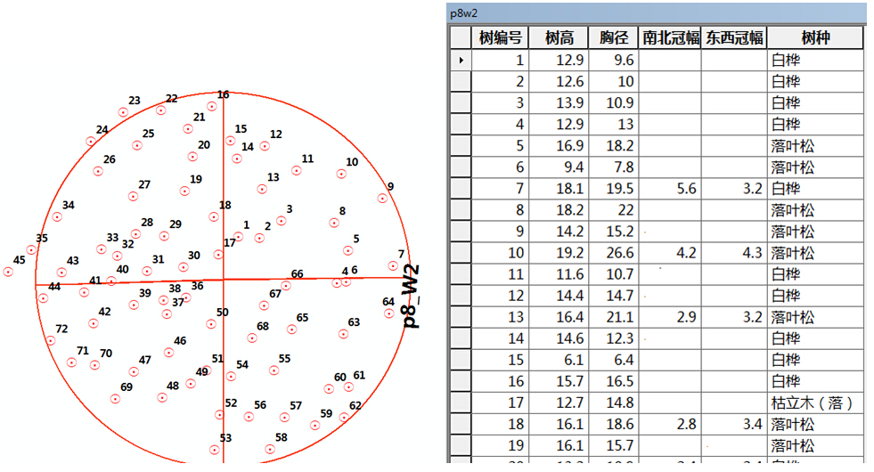 左图为入库的单木位置图,右图为入库的单木结构参数