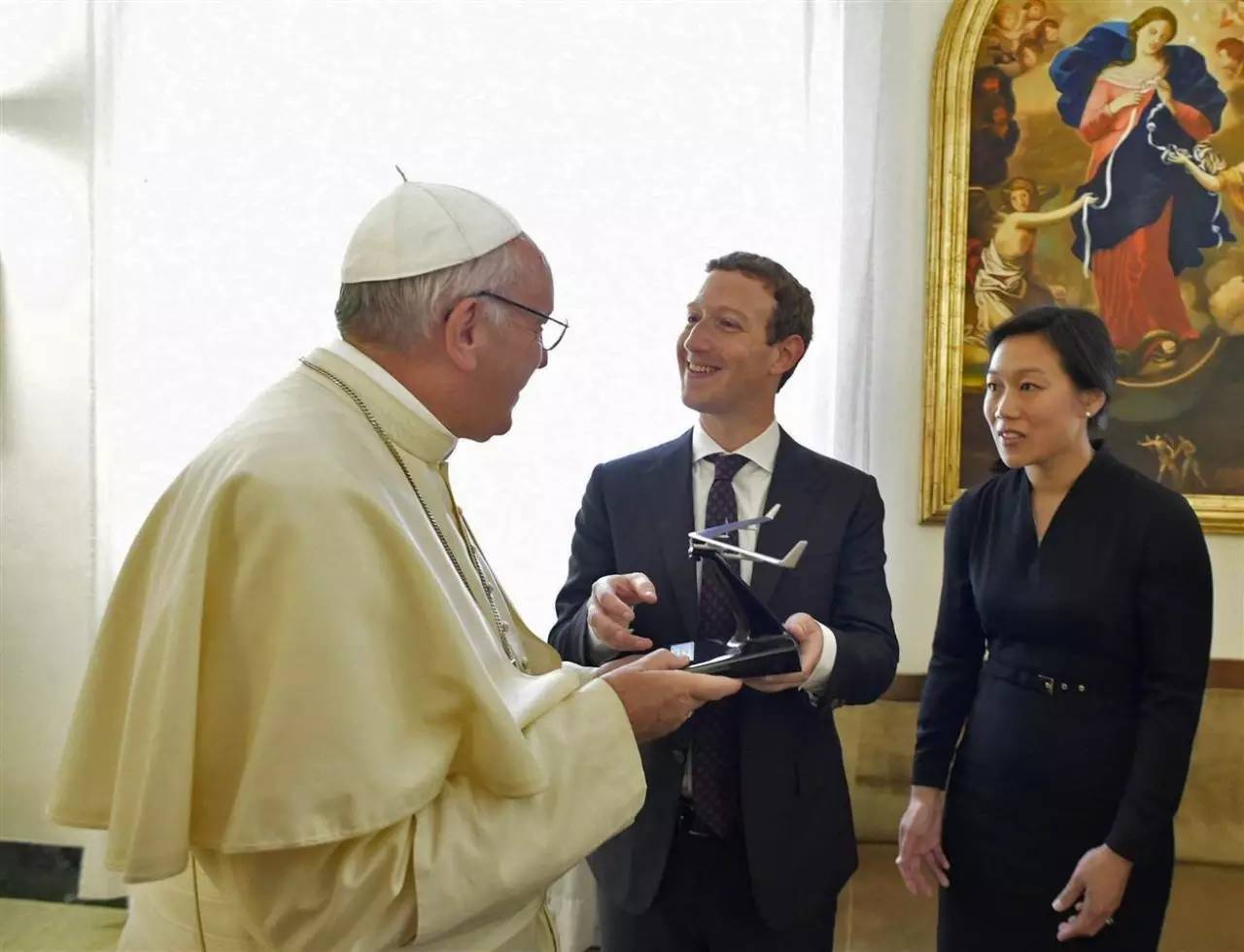 扎克伯格会面教皇,赠送无人机模型现场。