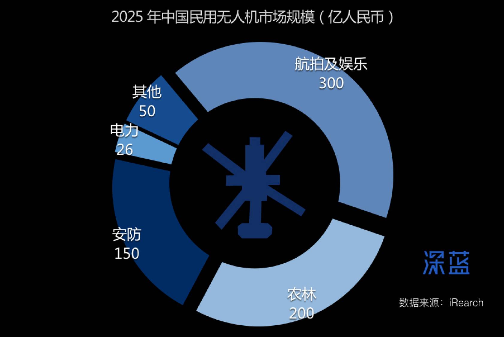 预计到 2025 年,国内无人机航拍市场规模约为 300 亿,农林植保约为 200 亿,安防市场约为 150 亿,电力巡检约为 50 亿,总规模将达 750 亿。