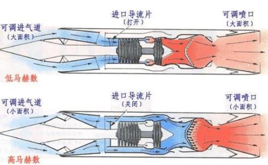 另外一个值得分析的地方就是报道中提及的飞行方式独特,笔者分析认为,这句话就是对国产串联式涡轮冲压发动机的最好解释。之所以这么说,是因为这种发动机非常独特,在飞行器3马赫速度以下时,使用前面的涡轮喷气发动机,由高速转子将空气压缩后在燃烧室将其与航空燃料混合点燃,产生高温高压燃气向后喷出的反作用力推动飞行器前进,当进入3马赫以上时,通过可调进气道和内涵道调节板的动作将涡轮喷气发动机转子部分和高速气流隔绝开来,此时由于速度极高,不需要涡轮叶片去转动压缩,直接通过外涵道进入冲压燃烧室与航空燃料混合点燃产生反向作用力推动飞行器前进。