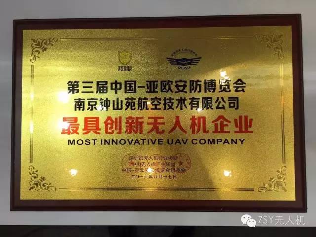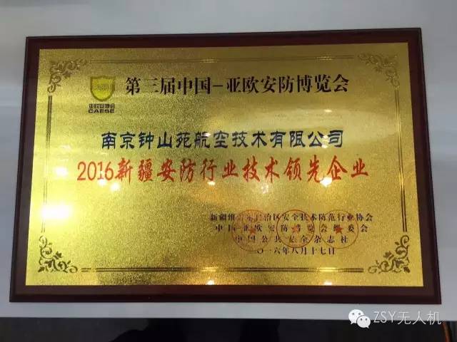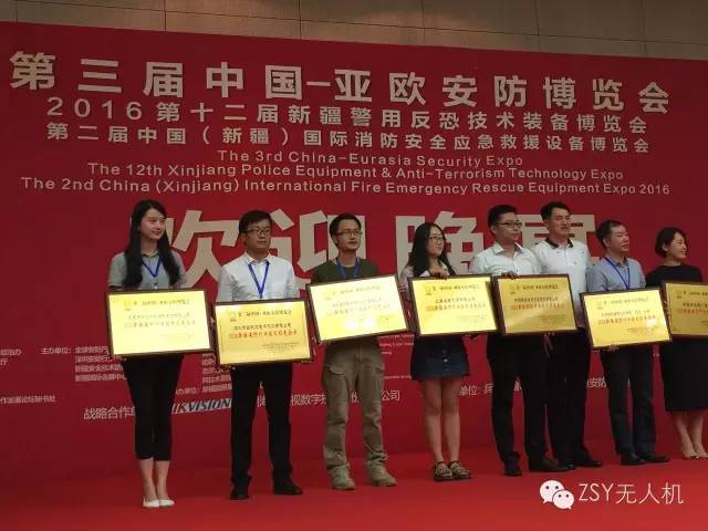 值得一提的是,在本届展会上南京钟山苑航空技术有限公司在众多参展企业中脱颖而出,经大会评选,荣获第三届中国-亚欧安防博览会“最具创新无人机企业”和“2016新疆安防行业技术领先企业”。