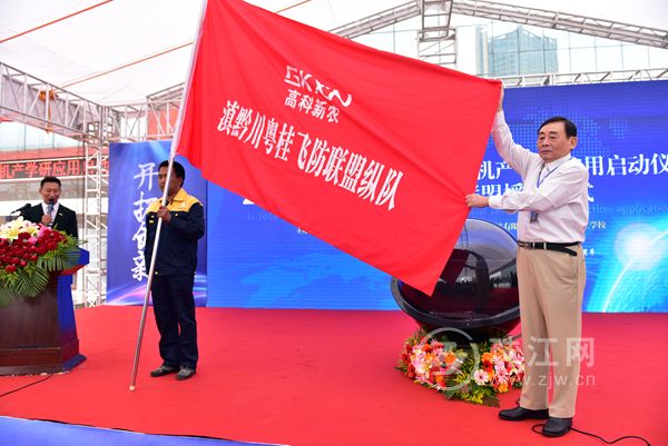 中国探险协会主席严江征向云南高科新农科技有限公司滇黔川粤桂飞防联盟授旗。