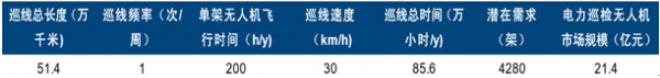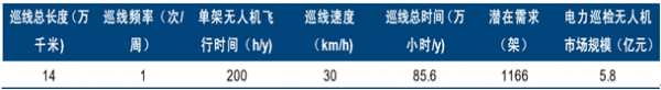 按照巡检总长51.4万公里、1次/周巡线频率、巡检均速30Km/h计算,每年的飞行时数应为85.6万小时,单机年平均飞行小时数按照200小时计算,则该领域无人机潜在需求架数约为4280架;按照均价50万/架单价计算,则电力巡线无人机市场规模为21.4亿元。