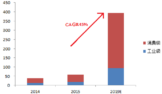 全球民用无人机在2014年迎来大约37.8万架的销量,其中工业级无人机销量约12.6万架,消费级无人机销量约25.2万架;在2015年大约销售民用无人机56.9万架,其中,工业级无人机销量约17.1万架,消费级无人机销量约39.8万架。IDC预测,到2019年全球无人机年销量将达民用到393万架,其中消费级300万台,CAGR达到60%;工业级无人机销量为93万台,CAGR达到45%。