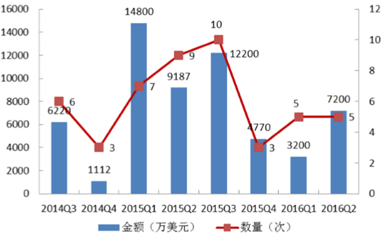 近两年无人机的兴起,引来了大量投资者的目光,特别是美国监管机构开始允许无人机进行有限商业运营,让全球资本加速了在民用无人机领域的投资。2014Q3-2016Q2,全球无人机市场投融资规模达到58689亿美元,其中2015年投融资规模占统计区间70%。其中,国内无人机公司投融资次数35次,国外17次,投融资轮次主要集中在天使轮和A轮。