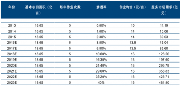 目前,全国各地作物平均作业频率为5次/亩/年,目前粮食作物和经济作物的平均作业价格为13.8元/亩,产品性能升级、作业效率提升和行业竞争,作业价格会逐步下降。预计到2023年,我国植保服务市场达到485亿元。