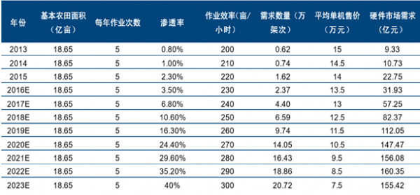 截至2015年末,全国耕地面积为20.25亿亩,其中含有难以稳定利用的耕地和根据国家政策需要逐步调整退耕的耕地,适宜稳定利用的耕地保有量为18.65亿亩。到2022—2023年,农业植保无人机硬件销售额将达到160亿元。