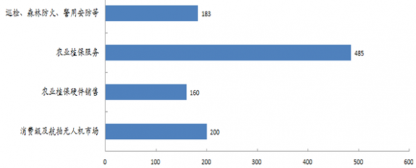 预计到2023年,我国民用无人机各细分应用领域的市场份额分别为:消费级及航拍无人机市场200亿元,农业植保硬件销售160亿元,农业植保服务485亿元,巡检、森林防火、警用安防等领域共计131.9亿元,合计976.9亿元。