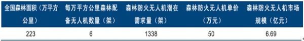 第八次全国森林资源清查显示,全国森林面积2.08亿公顷;?十三五规划末全国森林面积计划达2.23亿公顷,森林覆盖率提升23.04%。如果按每1万平方公里配备6架无人机计算,覆盖全国森林面积的潜在无人机需求量为1338架;按照50万/架的单价计算,森林防火领域无人机市场规模为6.69亿元。