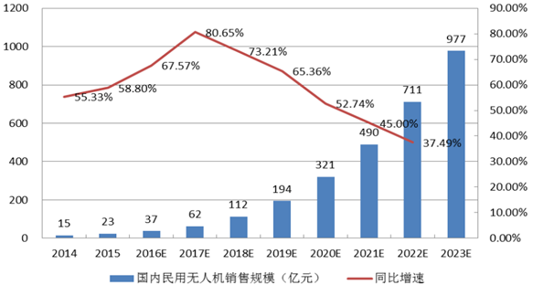 2014年国内民用无人机产品销售规模15亿元,2015年销售规模23.3亿元,同比增长55.3%。据IDC数据预测,2019年中国民用无人机市场销售规模达到390万台,合计约600亿元。预计到2023年,国内民用无人机市场规模将会达到976.9亿元,年复合增长率59%。