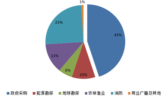 目前在工业级无人机细分应用领域,政府采购占比45%,消防25%,能源勘探10%,地球勘测6%,农林渔业13%,商业广播及其他1%。预计未来各应用领域不同程度的放量增长,将改变目前工业级无人细分应用占比。