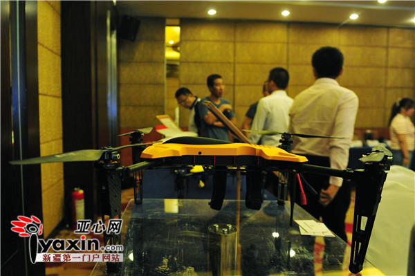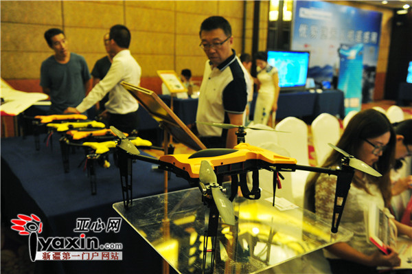 图为:9月6日,“Smaller than Smaller 2016无人机航摄超微传感器与实景三维技术应用全国巡展·乌鲁木齐站发布会”现场,参会人员观看北京观著信息技术有限公司生产的无人机