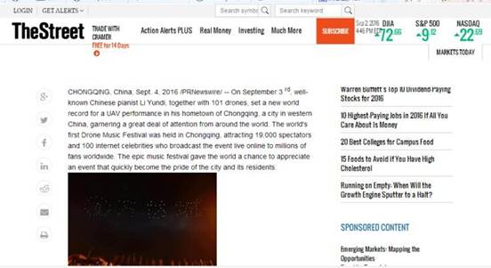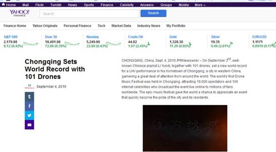 全球101架无人机巅峰音乐盛典亮相“世界的十字路口”纽约时代广场,与此同时,它还吸引了YAHOO!、CNBC、MarketWatch、Thestreet.com、ADVFN等230家国外媒体疯狂转载报道,曝光量高达79305449。