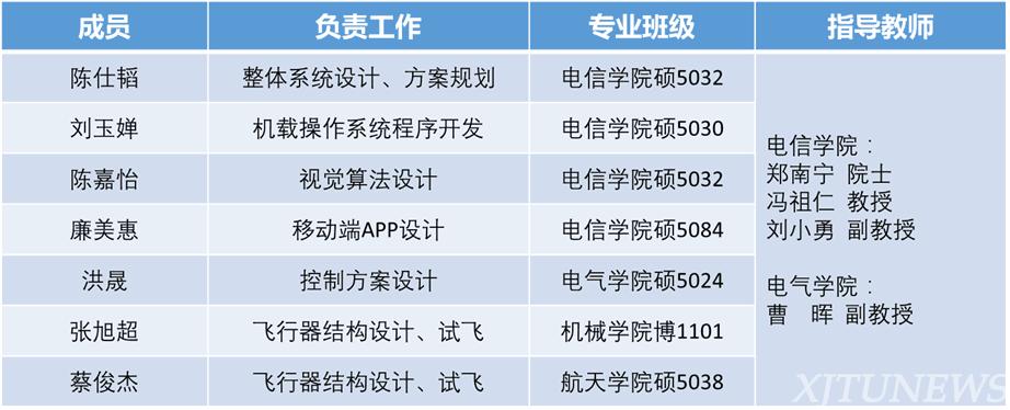 在校团委、就创中心、国际处、电信学院人工智能与机器人研究所的大力支持下,团队成员共同努力,连续三轮提交的技术方案及视频顺利通过了专家组的评审,成功晋级最终十强,顺利闯入总决赛。晋级第一轮比赛后,团队利用官方赞助及“西安交通大学——大疆学生创新实验基地”的无人机设备,迅速着手开发。第二轮比赛,成功实现AprilTags稳定识别,可实时获取Apriltags三维位姿信息,并能对时速30km/h运动目标稳定跟踪。第三轮比赛,基于Guidance及惯导系统,成功实现无人机室内目标搜索及避障,并可将目标信息、无人机航迹传回到手机端实时显示;成功实现无人机在时速25km/h汽车上移动降落。在晋级总决赛后的深度开发阶段,实现了无人机搜救任务的全流程,通过APP或Ford F150上的按键,可实现无人机一键起飞、降落及放弃任务等功能,能够基于感知周围的障碍物重新规划飞行路径,实现了PID算法控制无人机稳定跟踪及降落。