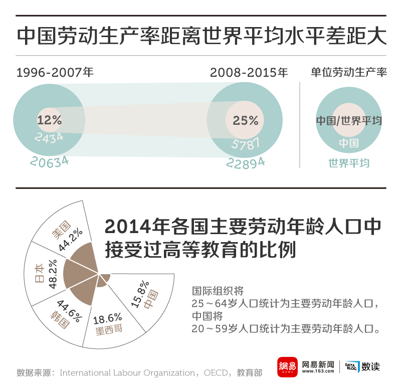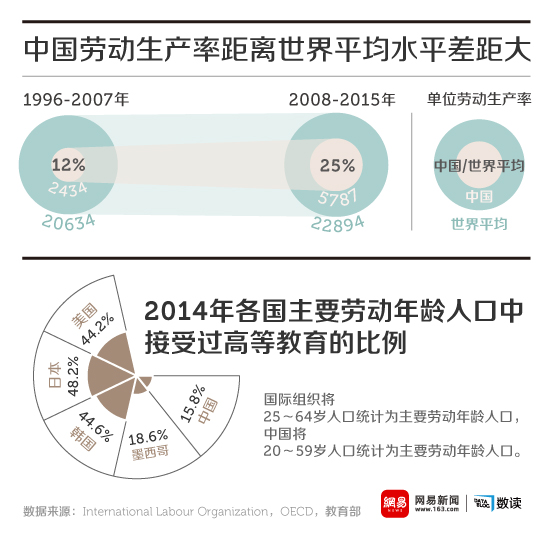 教育发展的结果是人才红利的逐渐显现,2013年经合组织成员国及G20国家中25-34岁拥有大学学位的人口里有17%是中国人,中国成为世界上人才储备最丰厚的国家。但是丰富的人才储备一方面大量流向海外,一方面还要面对僵化的体制,制约着生产效率的提高。根据天则经济研究所的统计,在中国经济中有重要地位的国有工业企业真实资产收益率常年为负,而在日益增长的服务业中,由于政策管制,市场化程度不高,许多劳动力进入后也无法提高劳动生产率。