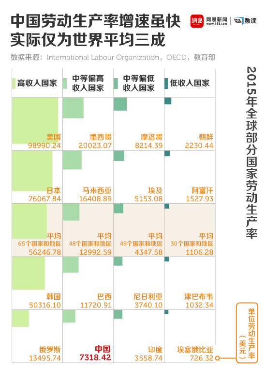 根据国际劳工组织的数据统计,2015年全球劳动生产率高如美国有98990.24美元,低如埃塞俄比亚仅为726.32美元。中国作为中等偏高收入国家,2015年单位劳动生产率为7318.42美元,远低于同档的巴西、墨西哥和马来西亚等国,甚至低于中等偏低收入的北非国家摩洛哥。中国劳动生产率的增长曾在2007年达到高峰,但是受经济大环境的影响,08年后增速明显减缓,虽然仍高于多数国家的增长水平,但实际差距依然巨大。
