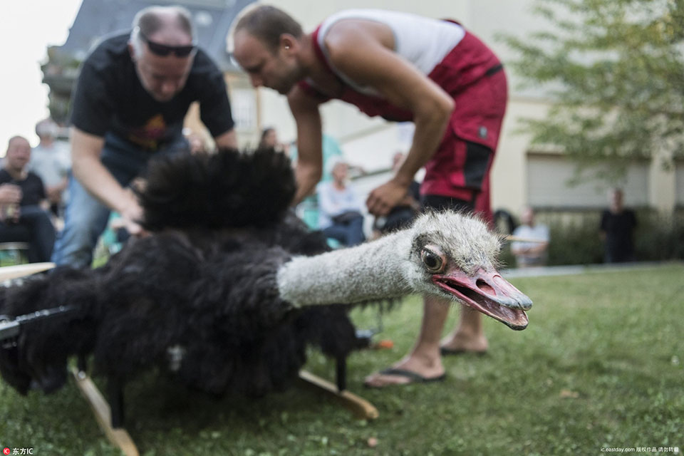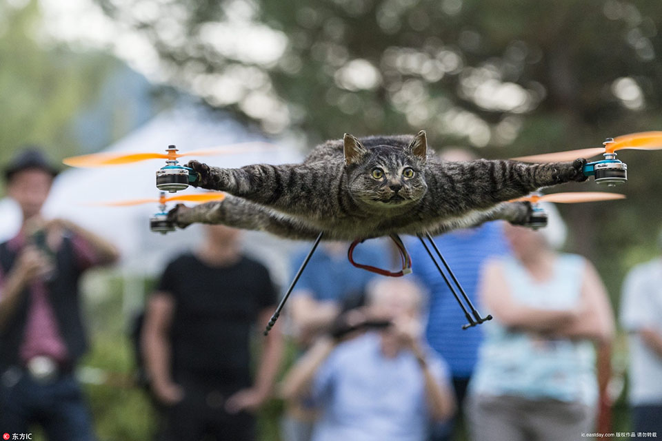 当地时间2016年9月9日,瑞士伯尔尼,猫咪无人机。荷兰艺术家BartJansen和ArjenBeltman在自然历史博物馆的院子里展示他们的“动物标本无人机”系列。...