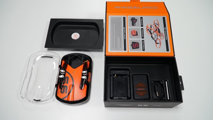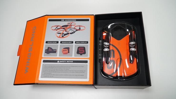 打开S6包装盒,包装盒盖上印有配件使用说明和一些使用、注意事项。S6掌上智能无人机的主机放在一个易于随身携带的“S6随身盒”里面。