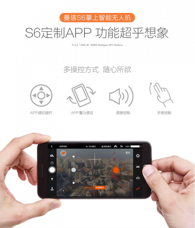 相机方面,S6拥有1300万像素和三轴防抖系统的相机,4K高清视频拍摄,在117°大广角取景。针对复杂的拍摄情况,曼塔智能S6支持全景环拍、慢动作拍摄、延时摄影、自动跟随、自定义飞行轨迹动作等特殊任务。