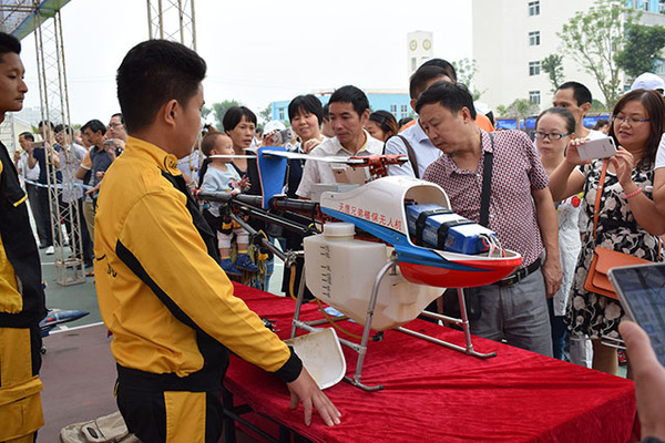 现场工作人员潘先生说,载药17KG的TY-787植保无人机具有高效省力、安全环保、节约成本、智能化程度高,符合现代农业生产的要求,真正解决了农业大户用工难及大型机械进田难的问题,为了加速植保无人机的推广,天鹰兄弟推出了无人机的免费培训班,指导大家更好的掌握无人机喷药技术,同时为了培养更多的技能人才,天鹰兄弟子公司也纷纷与当地职业技术学校校企合作、共同办学,加快推进现代农业化进程,在场的观众听了,纷纷点赞!