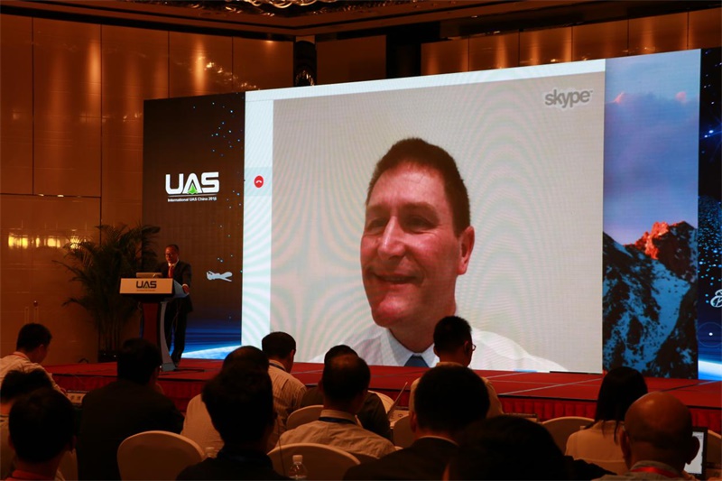 接下来是国际民航组织(ICAO)RPASP主席Michael Peter Gadd带来的演讲,由于Michael Peter Gadd在伦敦还有会议,无法到达会场,因此通过远程通信的方式完成了演讲。