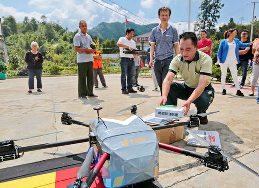 9月19日上午10点20分,在安吉县杭垓镇电商联盟服务中心内,一架六轴无人机缓缓起飞,十分钟后,10公里外的七管村室外建身场内,村邮员陈勇接收包裹,无人机送货第一单完成。意味着中国邮政第一条无人机投递邮路首飞成功,也使七管村成为全国首个邮路无人机投放点。
